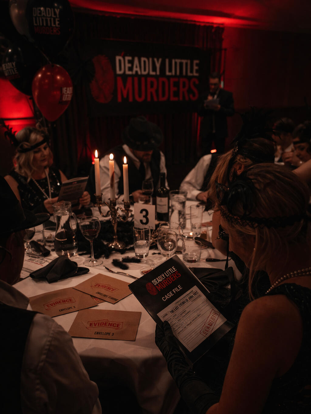 Deadly Little Murders events are hosted, table-based murder mystery experiences designed for venues, private groups and corporate events.Guests work through the case together, examine the evidence, challenge each other’s theories and decide what really happened.This is not an actor-led murder mystery night. There are no costumes, no stage interruptions and no forced participation. It is a guided cold case investigation experience built for discussion, deduction and a great social evening.Each event has its own setting and atmosphere, from 1890s explorers and 1920s Gatsby glamour to gangsters, molls and modern K-pop intrigue. A live host guides the room, but the verdict belongs to your table.Every table starts in the same place: one case, one victim, a shared set of facts and far too many questions. Then the evidence starts to open. New details emerge, assumptions crack, theories collide and the case begins to change shape. A host steers the room through each stage, but it is up to your table to decide what really happened.
